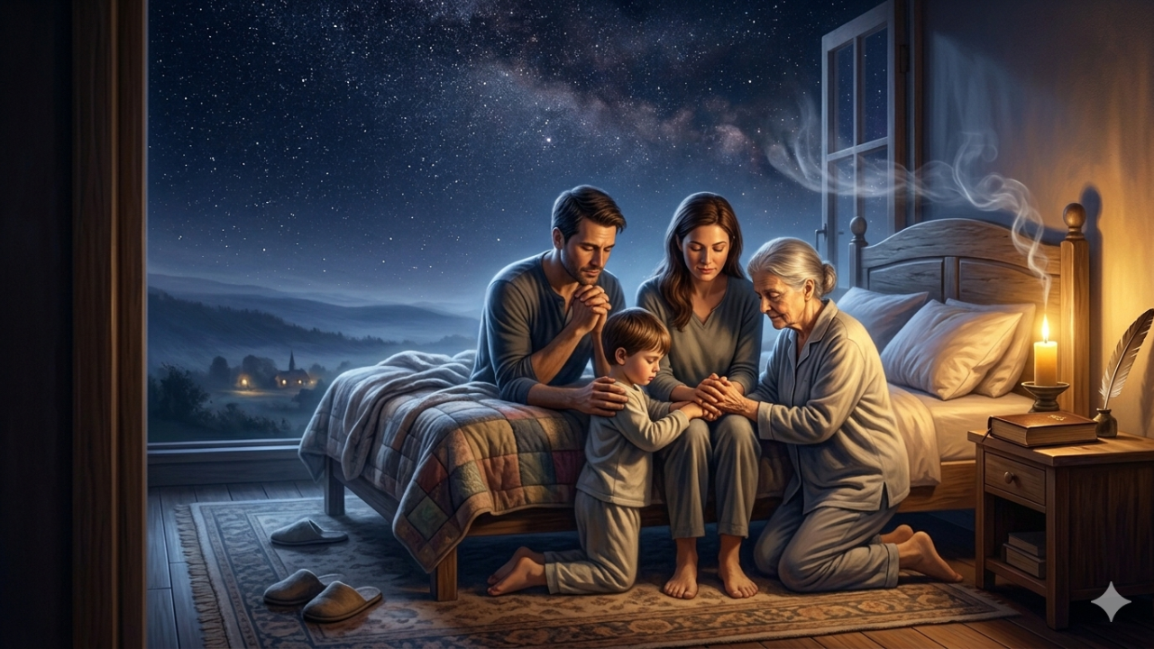A mother began praying a powerful night prayer for family after her children complained of feeling a dark presence in their rooms. She prayed Scripture over each room. She anointed the doorposts with oil. The next night, her children said the presence was gone. They slept peacefully.